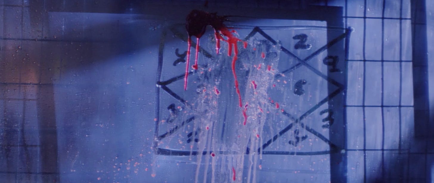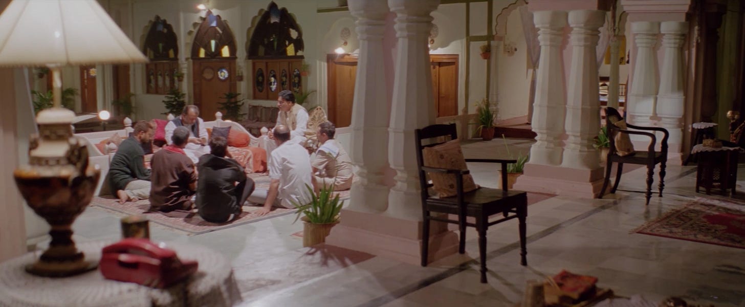 In my essay about Andhadhun, I wrote about Tabu’s character, Simmi, and her manipulative behavior towards practically everyone she encounters. While she plays a watered down version of Lady Macbeth in that movie, she plays the real deal in Maqbool as Nimmi, and does so with aplomb. Tabu delivers a flawless performance in this role, showcasing playfulness, cunning, and an enigmatic allure, crafting a character whose every gesture and expression speaks volumes. Not only does she draw Maqbool into an intricate web of emotions and intrigue, but the audience as well. She’s an indelible part of every scene she’s in. Early in the film, Abbaji chokes while eating, and Maqbool rushes to get water. Nimmi is in the next room, holding a jug of water, listening to the commotion of her husband gasping for air. Maqbool frantically reaches for the jug only for Nimmi to pull it away every time he gets close.