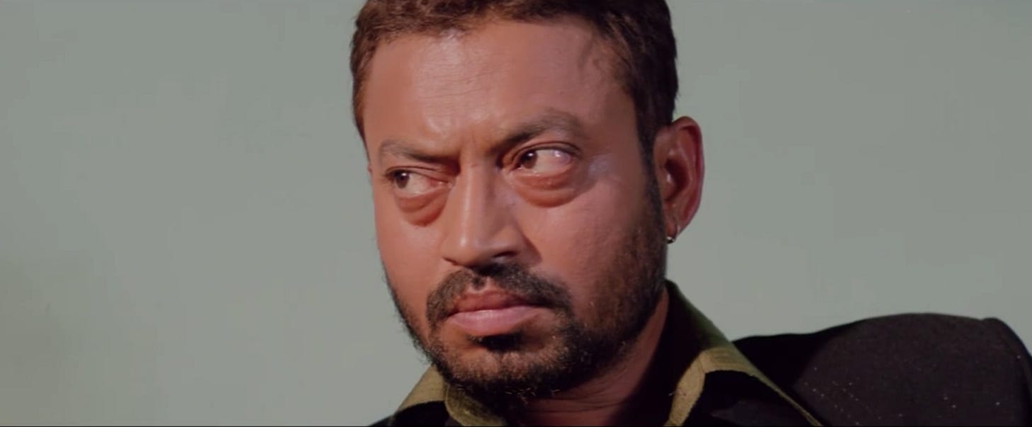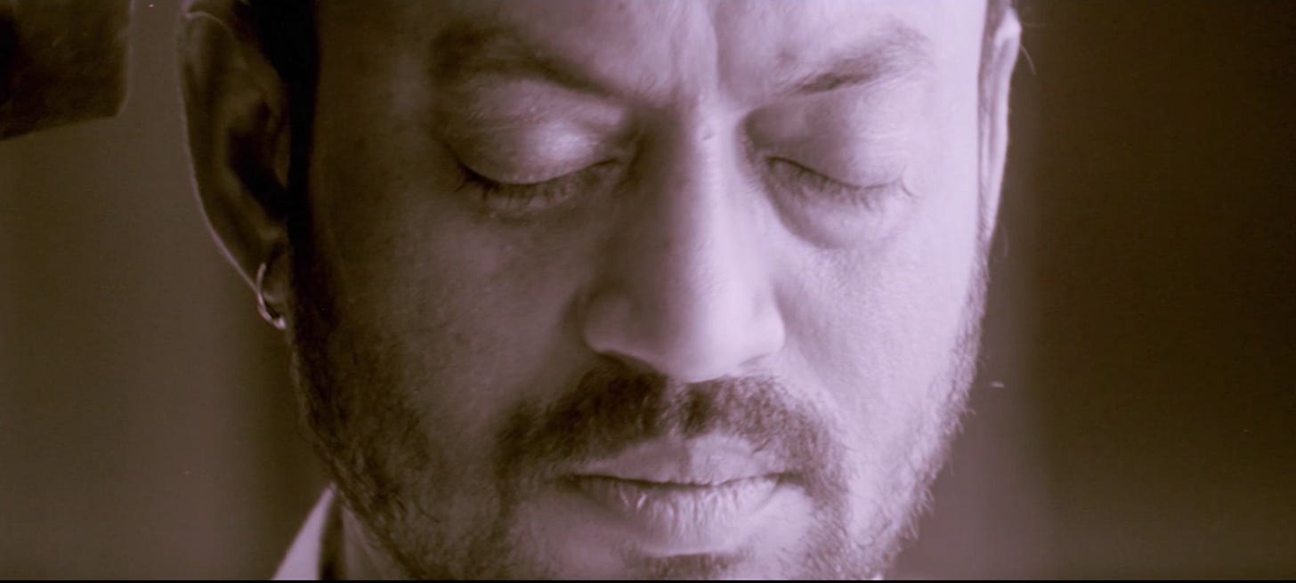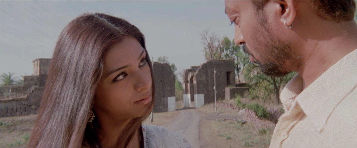 Nimmi’s devastating and dangerous invitation leaves Maqbool speechless, but while Tabu’s gaze doesn’t break as she delivers the line, Irrfan responds by trying to meet her gaze and failing. He tries to keep up, but buckles under the scrutiny of Nimmi’s eyes. Irrfan doesn’t play the character as shifty or fidgety, which would be antithetical to the gangster we’ve witnessed put a gun in a man’s face in moments prior. Rather, Irrfan depicts a man who does his best to look his paramour in the eye with the confidence of a hardened criminal, but who ultimately fails, displaying feelings of shame, apprehension, and sensitivity - all without saying a word. It’s what acting should be.